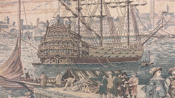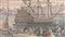 Arazzo meccanico, secolo XX. Raffigurante porto di mare con vascello e architet