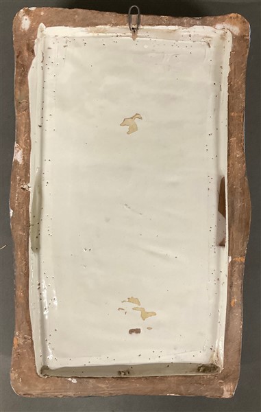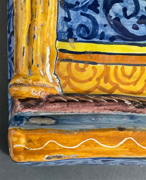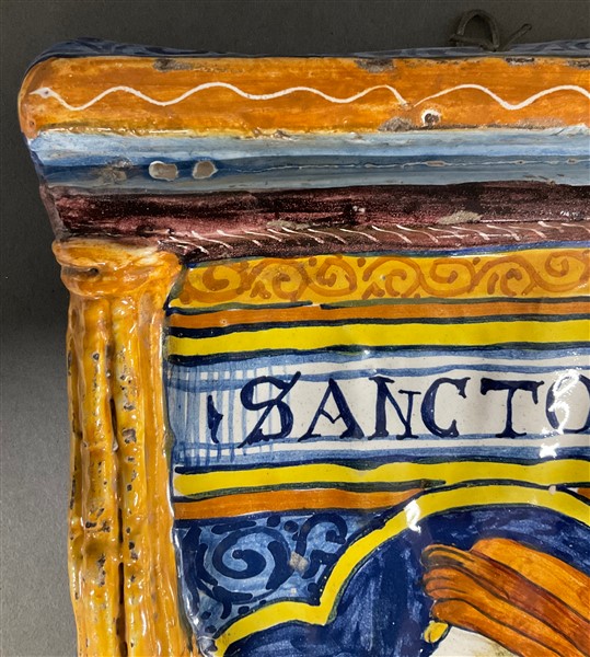 Manifattura meridionale, placca in maiolica dipinta in policromia centrata da figura di santo entro struttura architettonica (cm 22x38) (difetti)