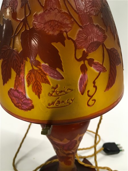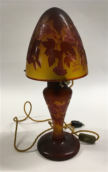 Lampada da tavolo in vetro a cammeo nei toni dell'arancione e del rosso e decorata con motivi floreali. Francia, prima metà secolo XX. Firma a cammeo "Zorin Nancy". (h cm 45) (lievi difetti)