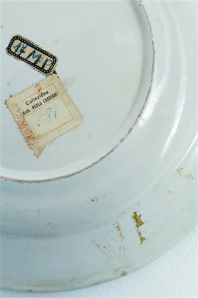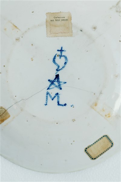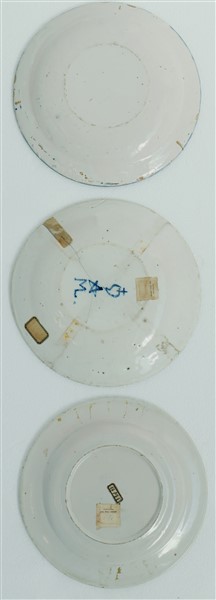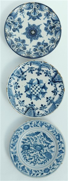 Manifatture di Savona, secolo XVIII. Lotto composto da due piatti similari in maiolica con decoro in monocromia blu a graticci entro volute e rami fioriti, uno marcato al retro, uniti a un piatto di altra manifattura. Etichette di collezione sul fondo (d. max cm 23,5) (difetti)