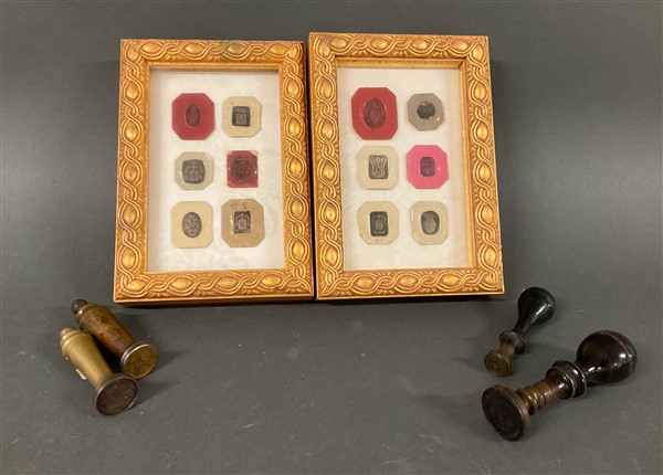 Lotto composto da quattro timbri per ceralacca uniti a due quadretti contenenti