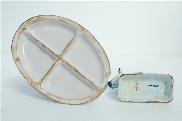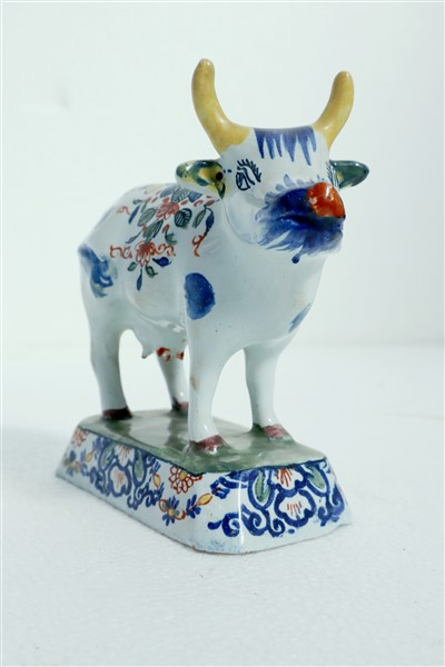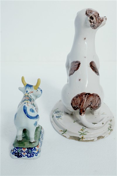 Manifattura diverse, secolo XIX. Figura di cane in maiolica su base ovale gradinata decorato in policromia a fiori; unito ad una figura di mucca in maiolica policroma della manifattura di Delft (h. max cm 24) (difetti)