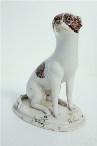 Manifattura diverse, secolo XIX. Figura di cane in maiolica su base ovale gradi