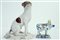Manifattura diverse, secolo XIX. Figura di cane in maiolica su base ovale gradinata decorato in policromia a fiori; unito ad una figura di mucca in maiolica policroma della manifattura di Delft (h. max cm 24) (difetti)