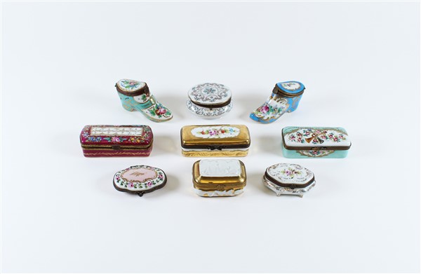 Lot 602 | Manifatture differenti. Gruppo di nove diverse tabacchiere in porcellana decora