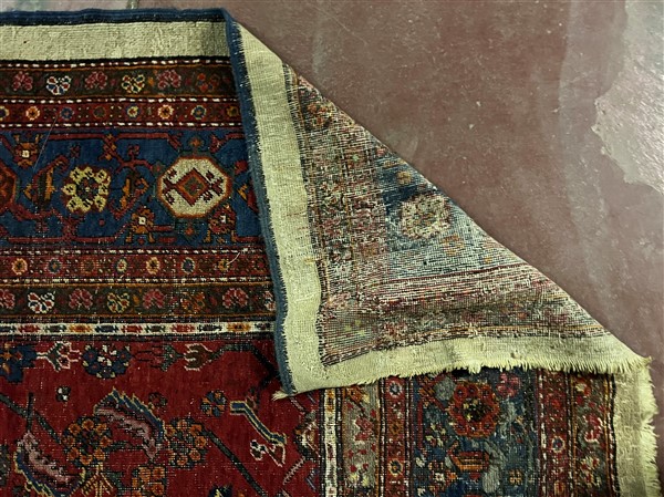 Tappeto galleria Karabagh, Caucaso, inizio secolo XX. Decoro con tre medaglioni romboidali a fondo rosso su campo blu notte (cm 534x221) (difetti e rapature)