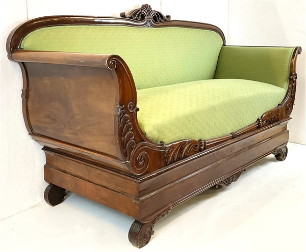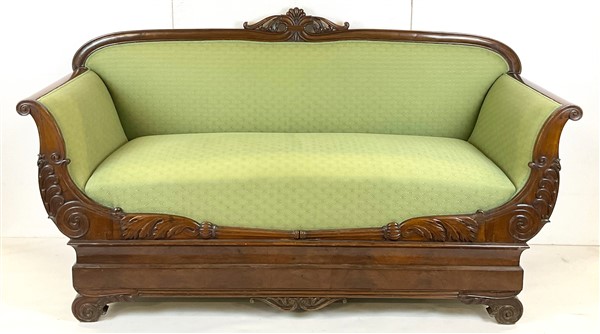 Divano a barca in mogano intagliato con cimasa a volute contrapposte e traforate, fronte decorato a volute divergenti e piedi a ricciolo. Secolo XIX (L cm 185) (difetti)