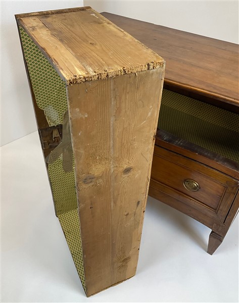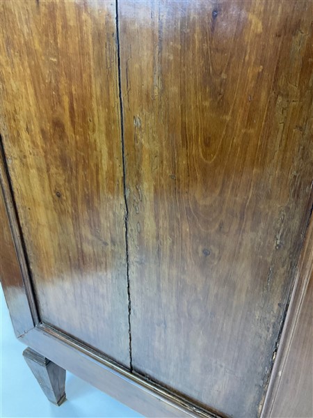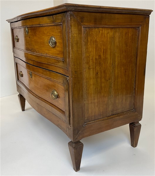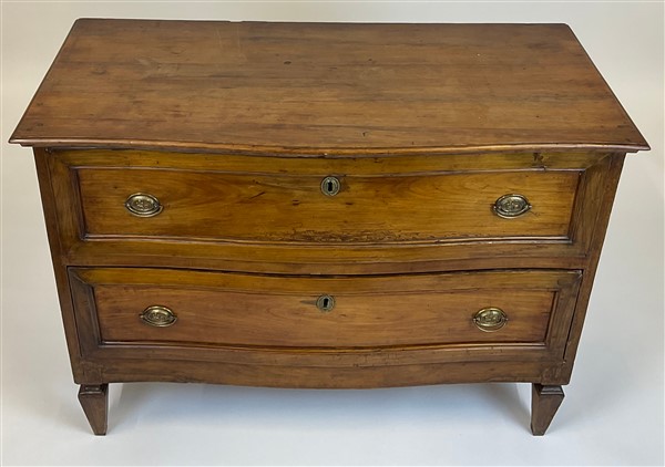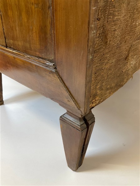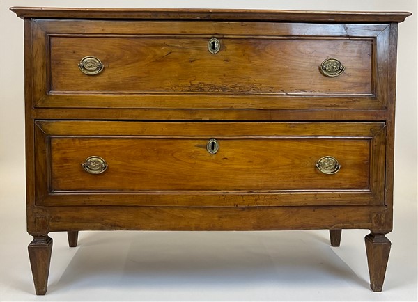 Cassettone in ciliegio, fronte mosso a due cassetti pennellati, gambe a obelisco rovesciato. Secolo XVIII (cm 115x85,5x56) (difetti e restauri)