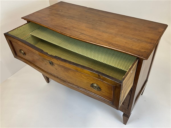 Cassettone in ciliegio, fronte mosso a due cassetti pennellati, gambe a obelisc