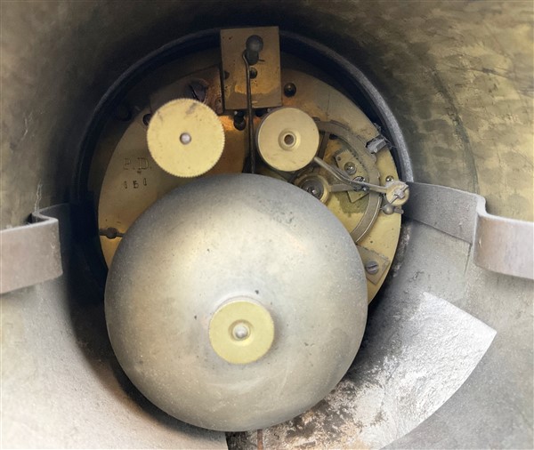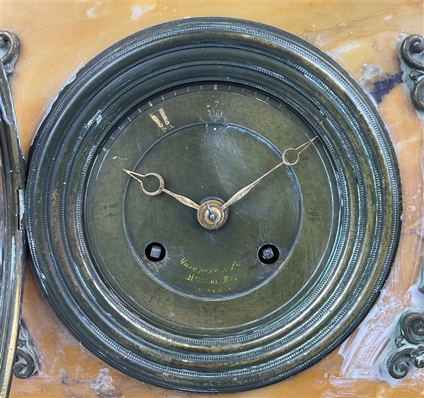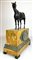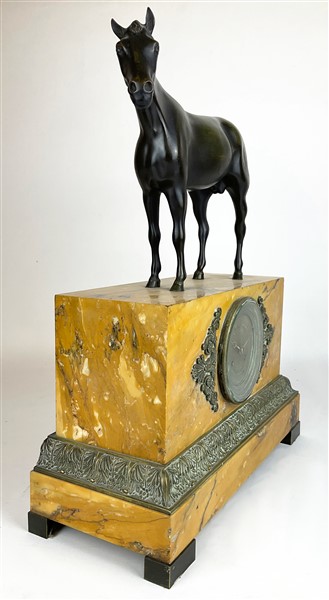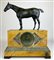 Pendola in marmo e bronzo con base a plinto sormontata da cavallo a tutto tondo. Quadrante dorato a numeri romani, movimento a due treni con suoneria delle ore e mezze su campanello. Seconda metà del secolo XIX (h. cm 48) (difetti)