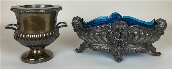 Lotto composto da fioriera in peltro sbalzato con decoro a volute fogliate, baccellature e putti, con vasca sagomata in vetro blu, unita ad un secchiello in rame argentato a vaso biansato e baccellato (L. max cm 41) (difetti)