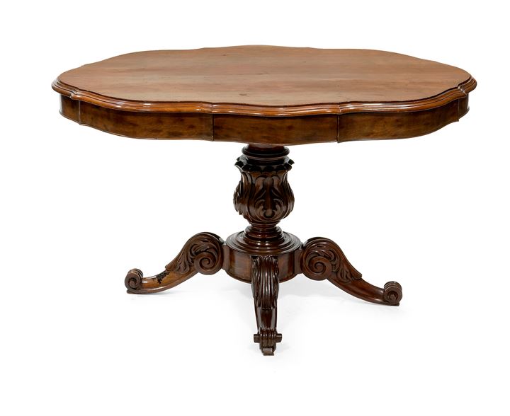 Tavolo di forma polilobata, epoca XIX secolo, piano in radica con due tirettini nella fascia; piantone in noce, scolpito, poggiante su quattro piedi. Rialzo in mogano