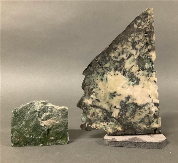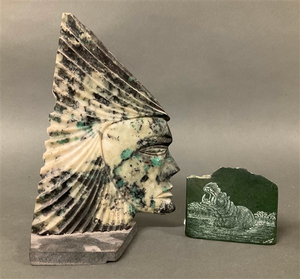 Lotto composto da una scultura e un'incisione in pietra dura (h. max cm 26) (difetti)