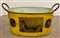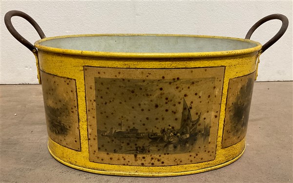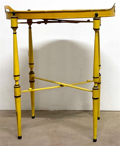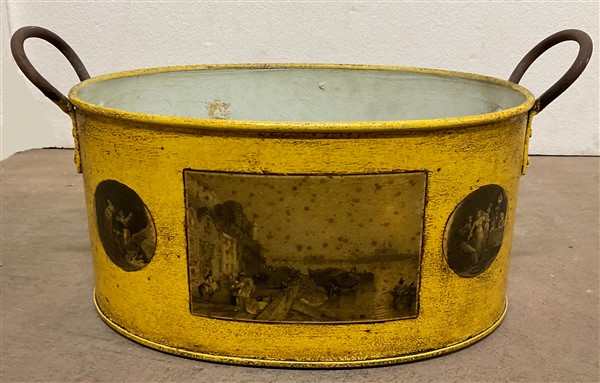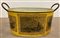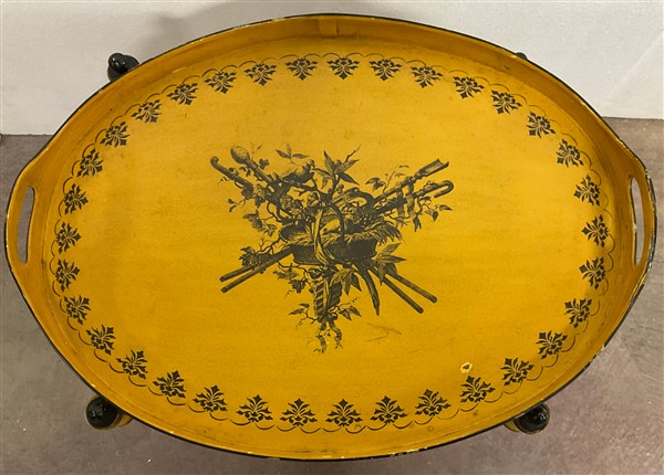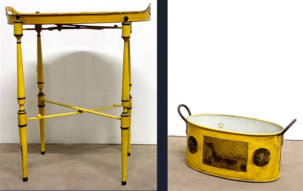 Lotto composto da un tavolino in metallo dipinto con piano a vassoio ovale decorato in monocromo a trofeo d'amore in nero su fondo giallo, sostegno richiudibile con quattro gambe (cm 50x60x37) unito a un cache-pot biansato di simile decoro (difetti)