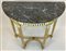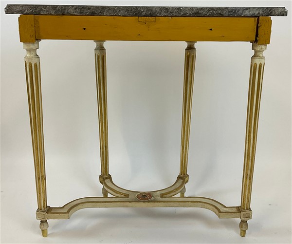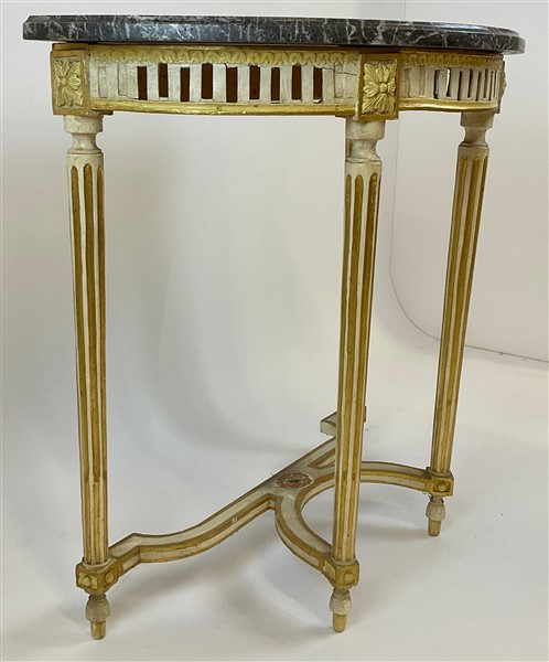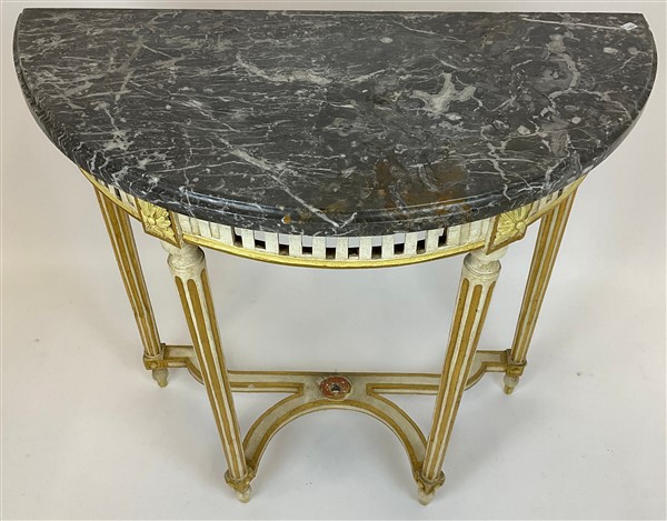 Console a demi-lune in legno intagliato, laccato e dorato con gambe scanalate raccordate da traverse sagomate, fascia sottopiano traforata e piano in marmo. Secolo XIX (cm 89x85,5x44) (difetti e restauri)
