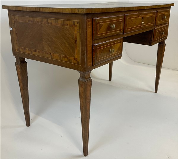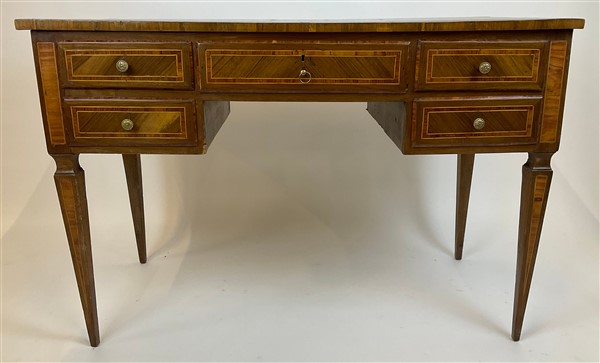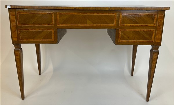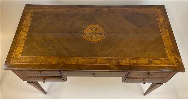 Scrittoio da centro lastronato, filettato e intarsiato in legni di varie essenze, fronte a cinque cassetti, gambe a obelisco rovesciato. Fine secolo XVIII (cm 119x79x59,5) (difetti e restauri)
