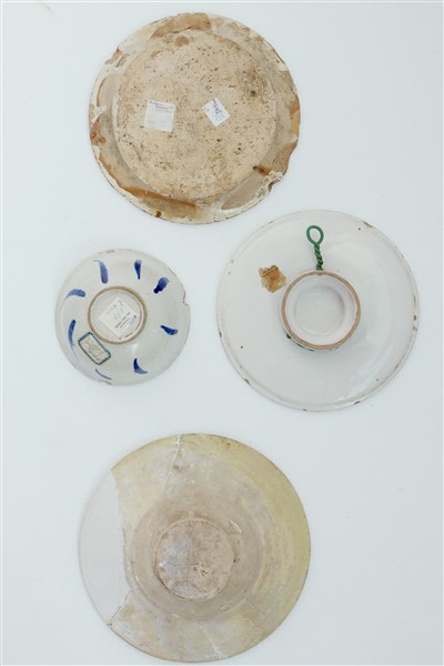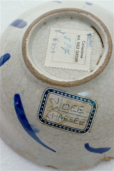 Lotto composto da un piatto, due ciotole ed un'alzata in maiolica di manifatture, epoche e decori differenti (d. max cm 21,5) (difetti e restauri)