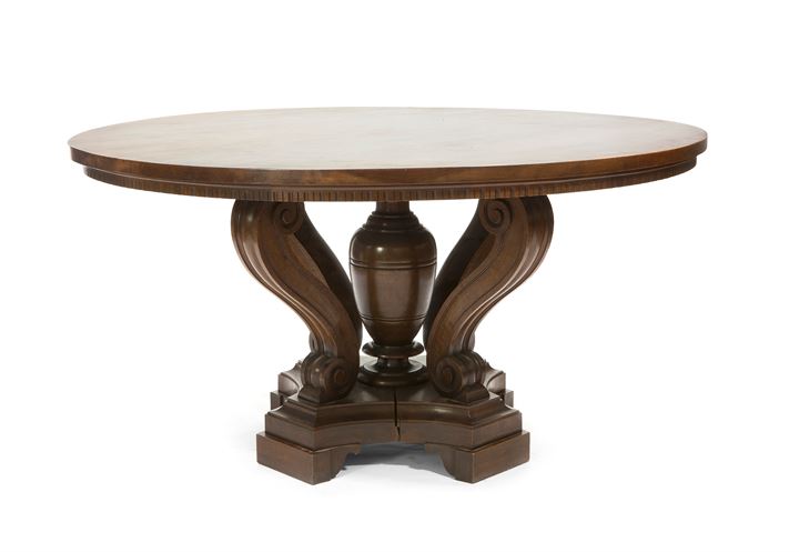 Grande tavolo di forma rotonda, in noce, a cestello, epoca XX secolo