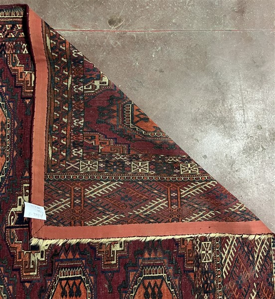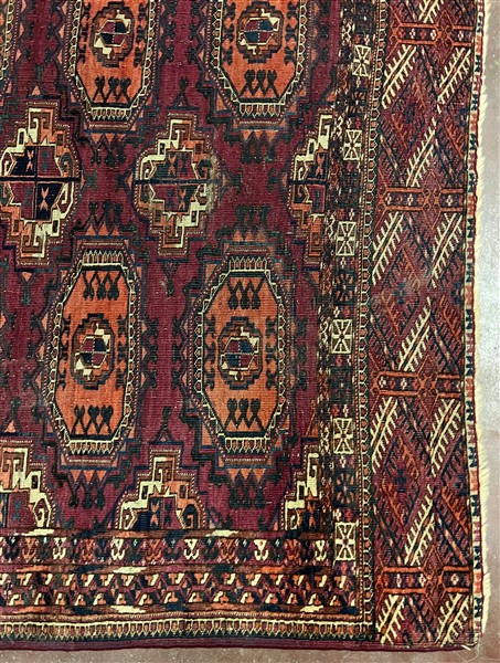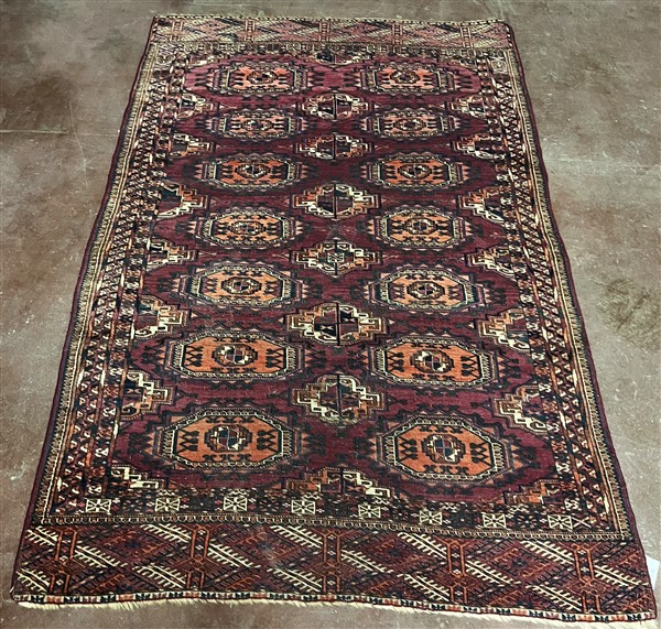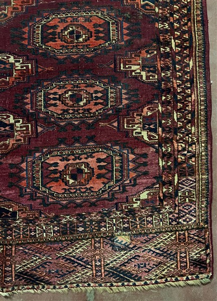 Tappeto Boukhara, Turkestan occidentale, inizio secolo XX. Decoro con due file di Gul su campo rosso (cm 188x121) (difetti)