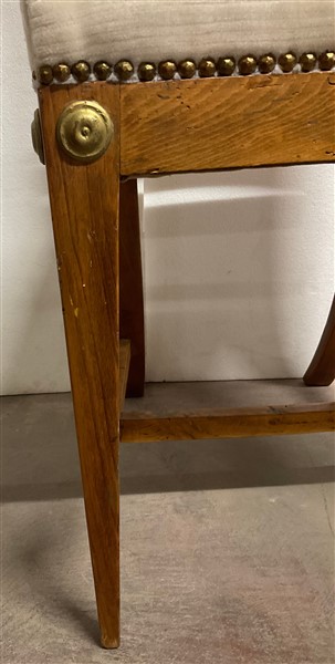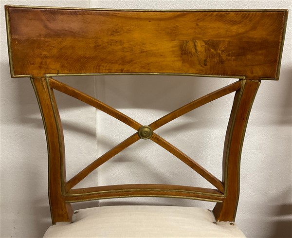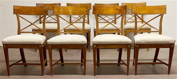 Gruppo di otto sedie in stile direttorio con schienale centrato da cartella a X, gambe posteriori a sciabola (difetti)