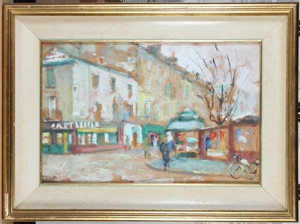 Firma indecifrata "Scorcio di città" olio su compensato (cm 28x43) tracce di fi