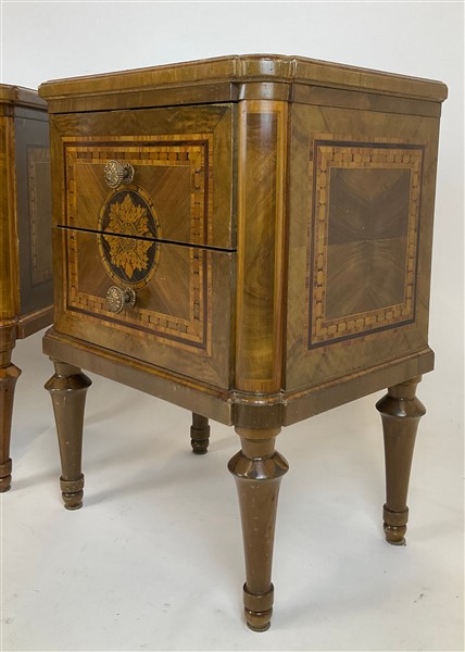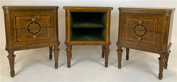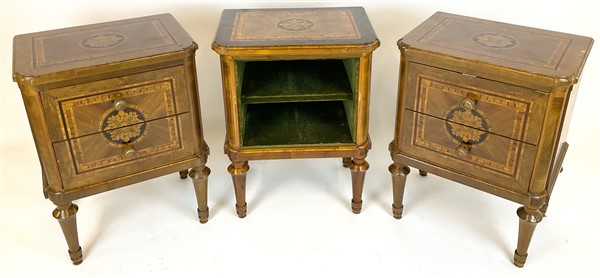 Coppia di comodini a due cassetti e un mobiletto con vano a giorno impiallacciati e intarsiati in legni vari a rosoni entro riserve (cm max 49x66x38) (difetti)