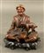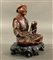 Okimono in bronzo raffigurante figura assisa con scimmia