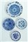 Manifattura di Delft, secolo XVIII. Lotto composto da tre diversi piatti in maiolica decorati in monocromo blu a motivo floreale stilizzato, al retro etichetta di collezione Paolo Candiani; uniti ad un piattino di moderna produzione (d. max cm 34,5) (difetti)