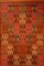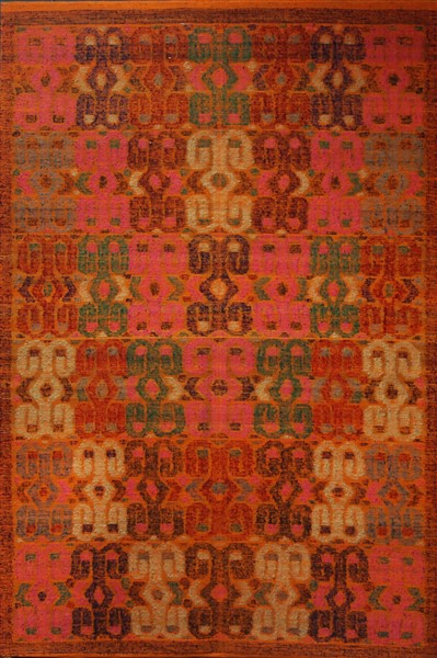 Grande pannello con arazzo tessuto a mano con tecnica jaquard in lana decorato con motivi geometrici ornati in file parallele a formare grandi motivi piramidaliche si differenziano in base alle tinte del filato. Sud America, secolo XX (cm 280x180 ca) (difetti)
