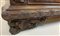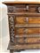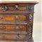 Cassettone in noce con fronte a quattro cassetti pannellati, montanti, pomoli e fregi intagliati a teste d'angelo, mascheroni e cartigli, bordi e piedi intagliati a volute fogliate (cm 132x100x58) (difetti)