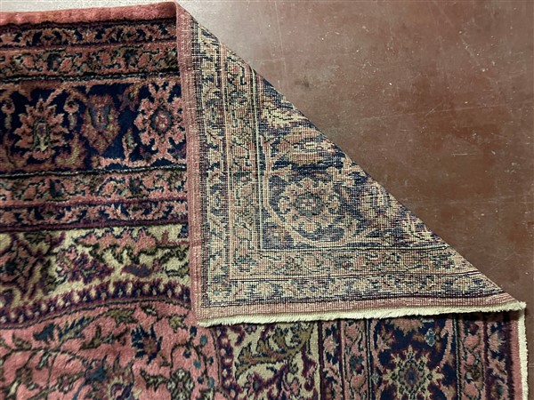 Tappeto Sparta, Anatolia, secolo XX. Decoro con medaglione blu su fondo rosa ornato da volute e personaggi (cm 328x242) (difetti)