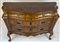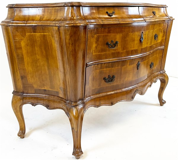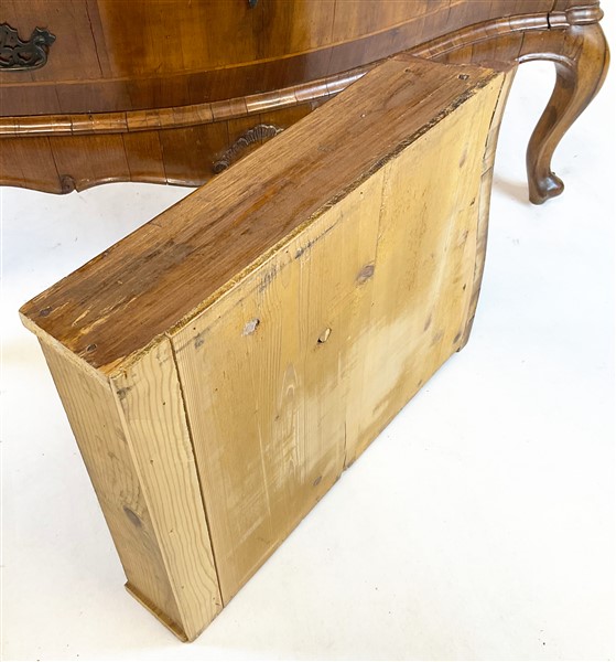 Cassettone di forma sagomata lastronato e filettato in noce con fronte a due cassetti più due allineati sottopiano, gambe mosse e bordure intagliate. Veneto (cm 134x84x55) (difetti)