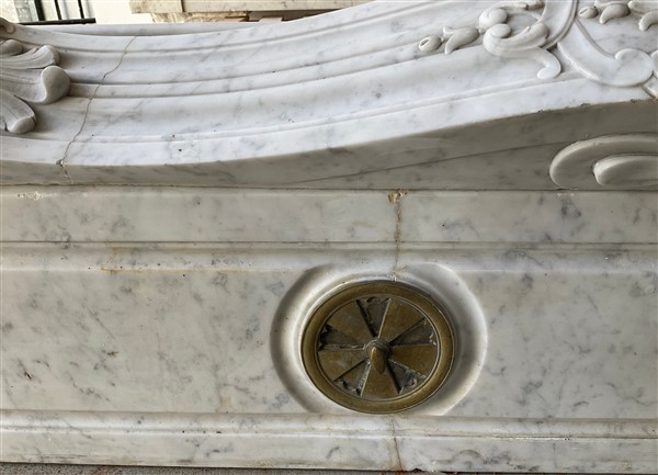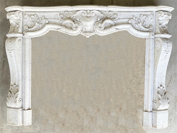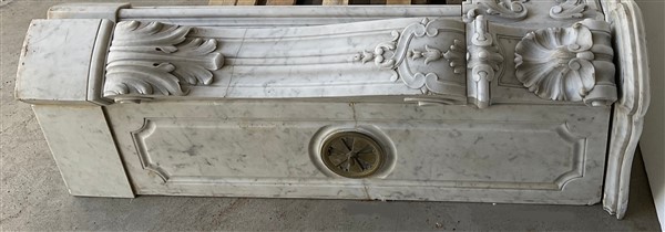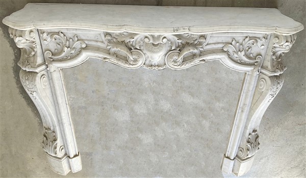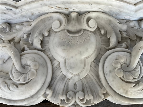 Camino in marmo con montanti scolpiti a volute, motivo di foglia d'acanto e rocaille, fascia a volute contrapposte dalle quali divergono ramage fogliate (cm 158x111x42) (difetti e restauri)