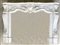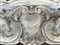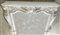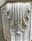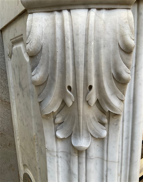 Camino in marmo con montanti scolpiti a volute, motivo di foglia d'acanto e roc