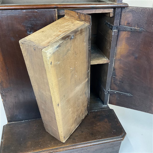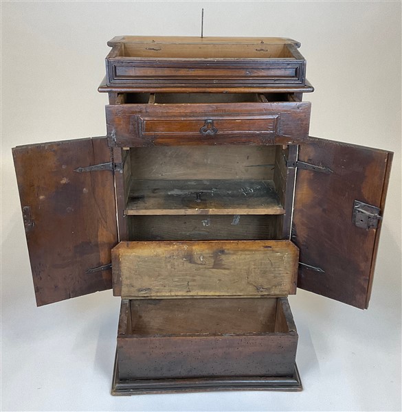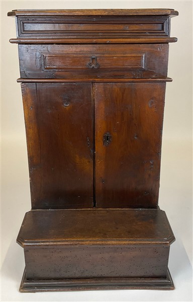 Inginocchiatoio in noce con fronte a due ante ed un cassetto, piano e base con pannello incernierato. Secolo XVII (cm 62x106x48) (difetti e restauri)
