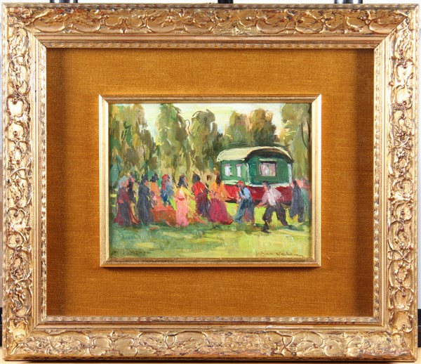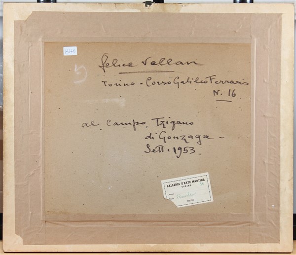 Lot 776 | Felice Vellan "Al campo tzigano di Gonzaga" 1953, olio su cartoncino (cm 18x23,5