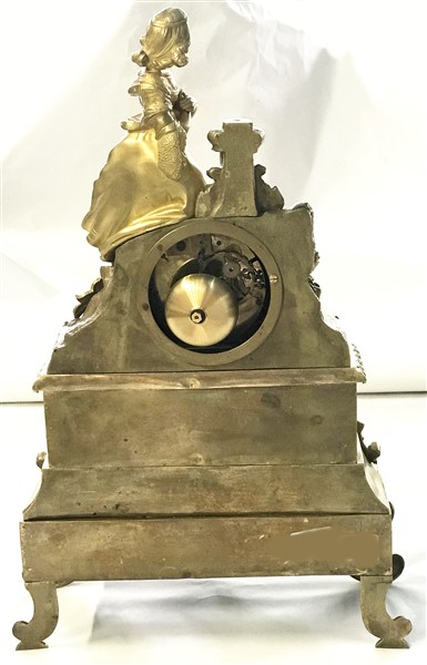 Pendola in bronzo dorato con base a plinto sormontata da figura allegorica, sec