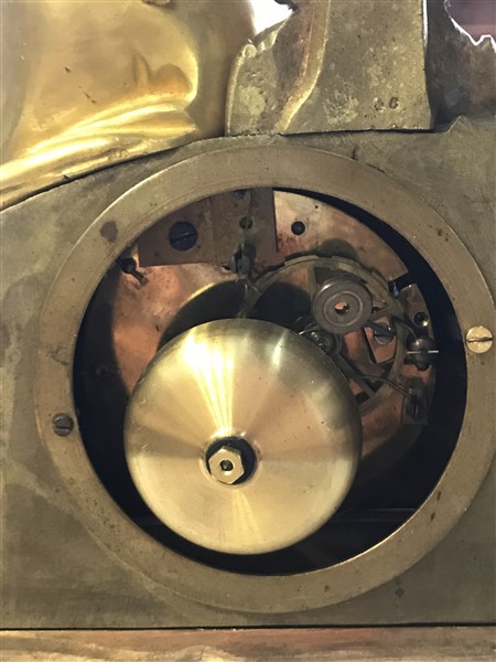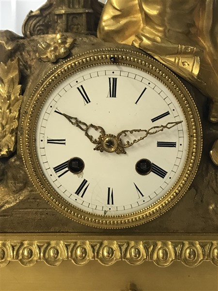 Pendola in bronzo dorato con base a plinto sormontata da figura allegorica, secolo XIX (cm l 27,5x h 43)(difetti e mancanze)