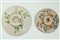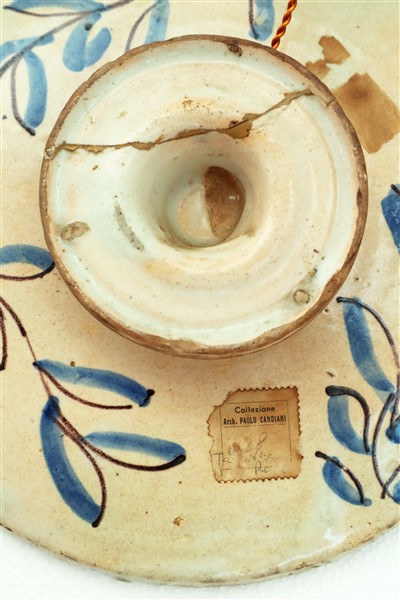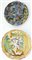 Manifattura di Talavera de la Reina, Spagna, secolo XVII. Lotto composto da due diverse alzate in maiolica dipinta in policromia con decoro a motivo zoomorfo entro paesaggio. Etichette di collezione sul fondo (d. max cm 21,5) (difetti e sbeccature; una con restauro alla base)
