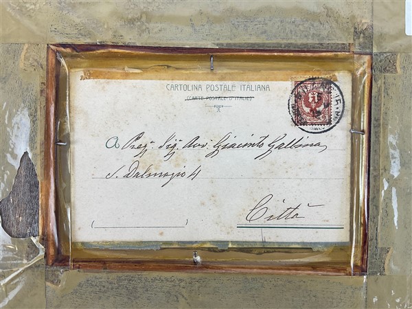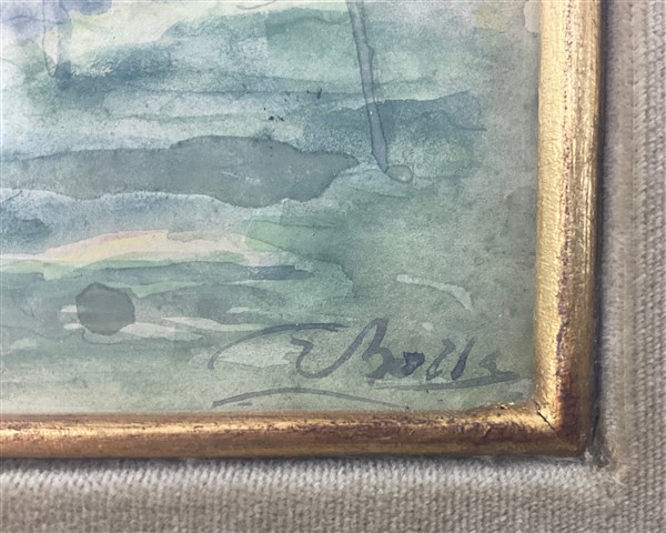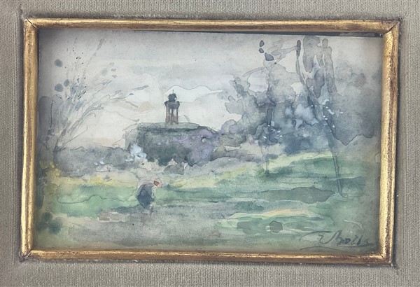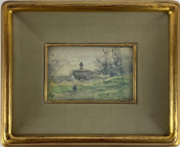 Lot 786 | Emilio Borsa "Scorcio fluviale con figura" acquerello su cartolina (cm 9x14) Fi