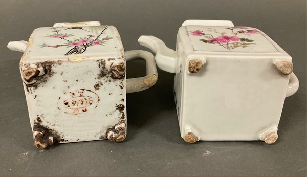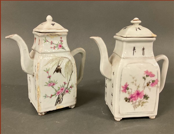 Manifattura cinese, lotto composto da due teiere in porcellana decorata in policromia e con iscrizioni (difetti e restauri)