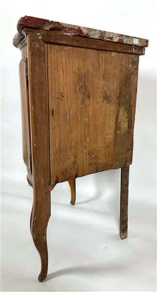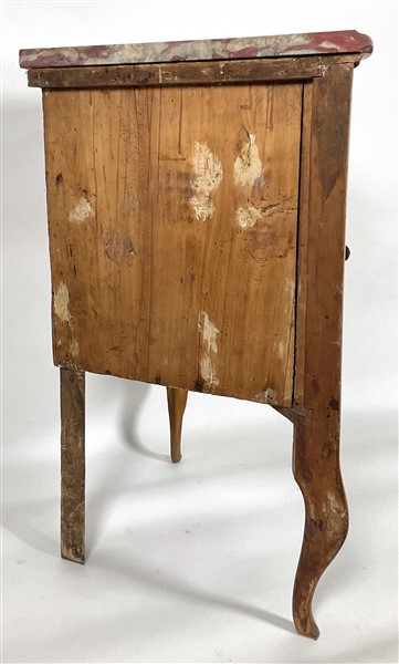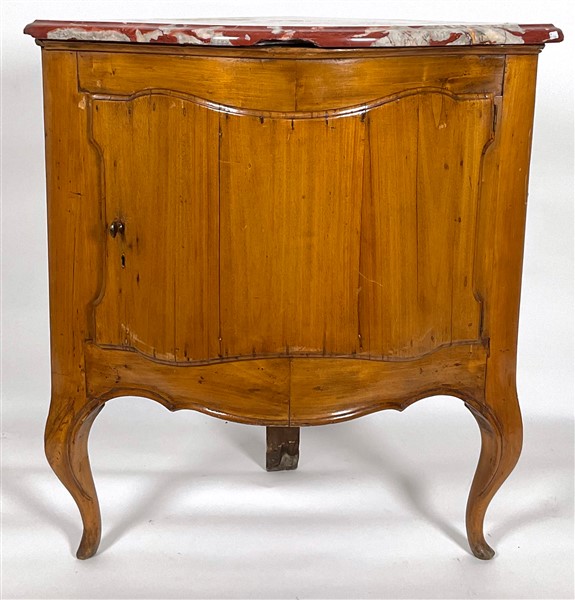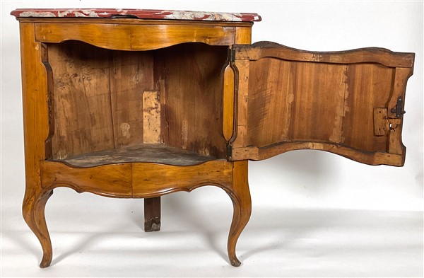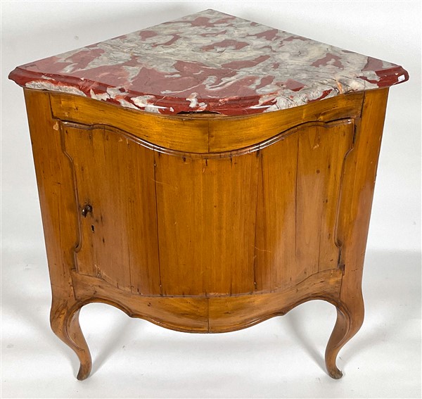 Cantonale in ciliegio con fronte ad un'anta sagomata, gambe e grembialina mosse, piano in marmo. Parma, fine secolo XVIII. Piano di epoca posteriore (cm 55x87x55) (difetti e mancanze)
