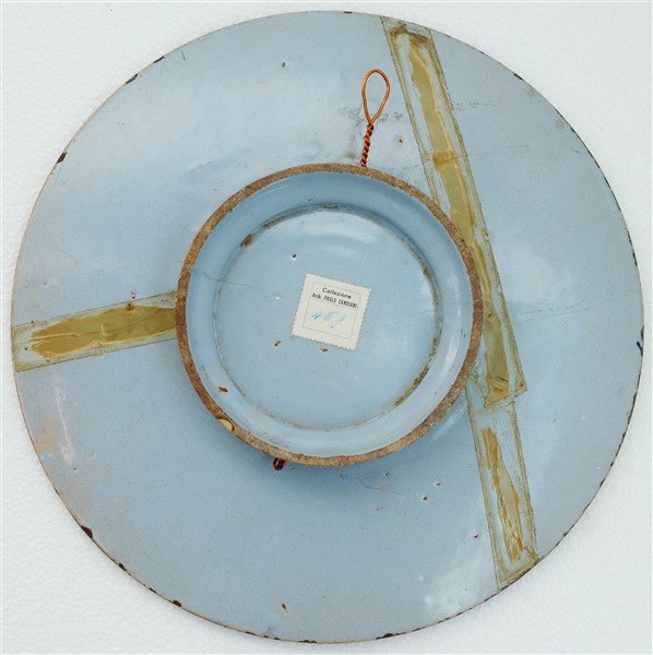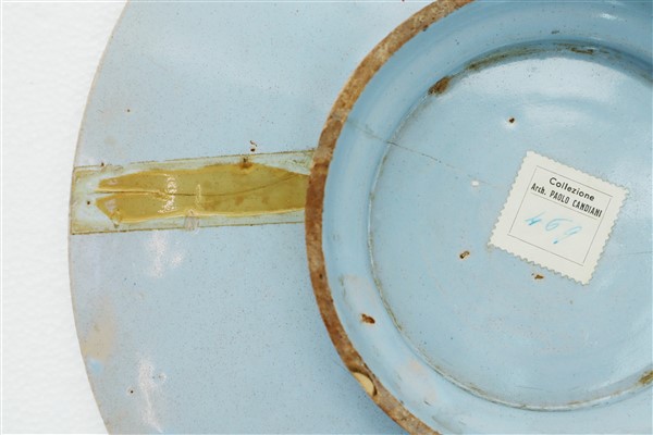 Manifattura di Pavia, secolo XVIII. Alzata in maiolica con decoro in blu con figura femminile entro paesaggio. Etichette di collezione sul fondo (d. cm 26,5; h. cm 4) (restauro e sbeccature)