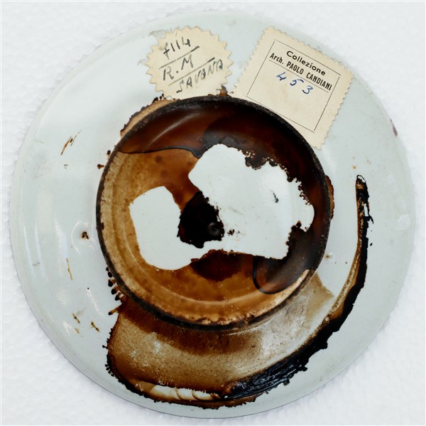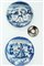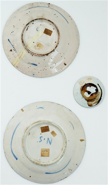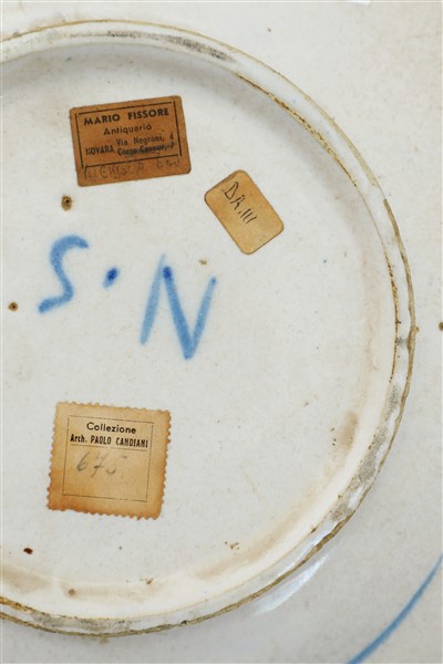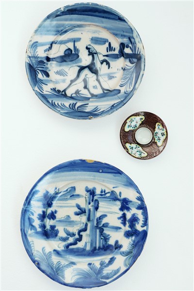 Manifattura di Savona, secolo XVIII. Lotto composto da due piatti in maiolica con decoro in blu a paesetto e sottotazza trembleuse a fondo spugnato manganese e paesetti entro riserve. Etichette di collezione sul fondo (d. max cm 27,5) (difetti e restauri)