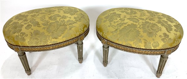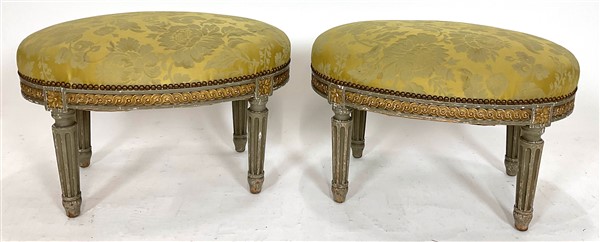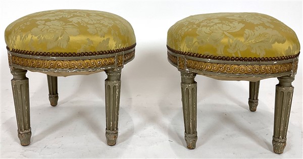 Coppia di tabouret in legno intagliato, laccato e dorato con quattro gambe rastremate e scanalate, decorate nella fascia ad intagli con motivi di meandri e rosette, rivestimento in tessuto damascato borchiato. Fine secolo XVIII (cm 61x40x40) (difetti)