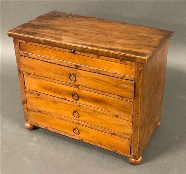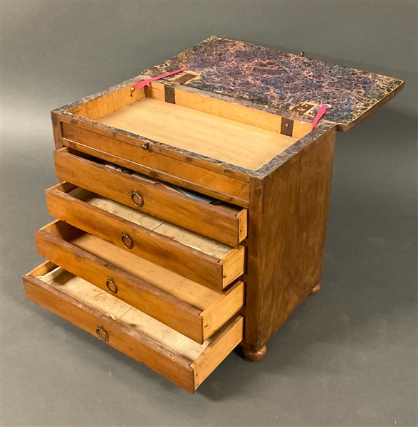 Portagioie in forma di cassettone con piano apribile e fronte a quattro cassetti con chiusura segreta, piedi torniti. Secolo XIX (cm 36x29,5x20,5) (difetti)