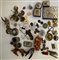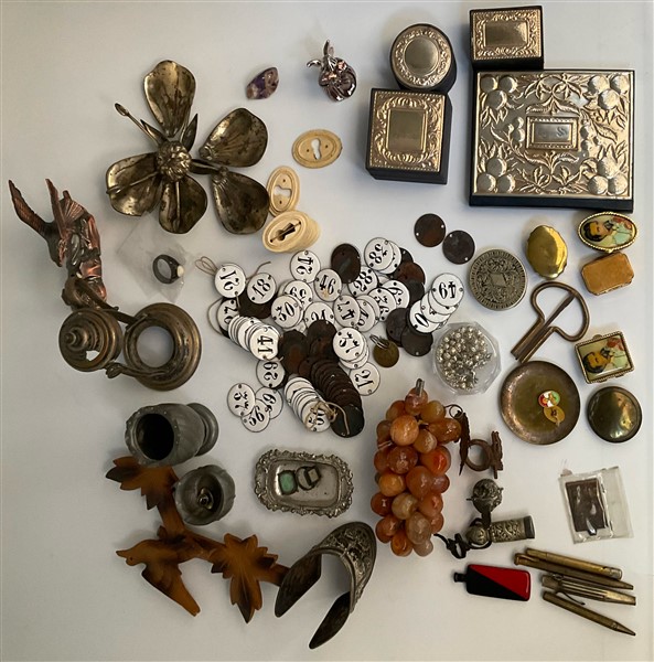 Scatole contenente numerosi oggetti diversi in lamina d'argento e metallo (dife