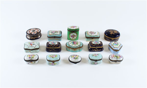 Manifatture differenti. Gruppo di quindici diverse tabacchiere in porcellana decorata in policromia a motivo floreale, trofeo e paesaggio con profili in oro, bordure in metallo (lievi difetti)