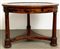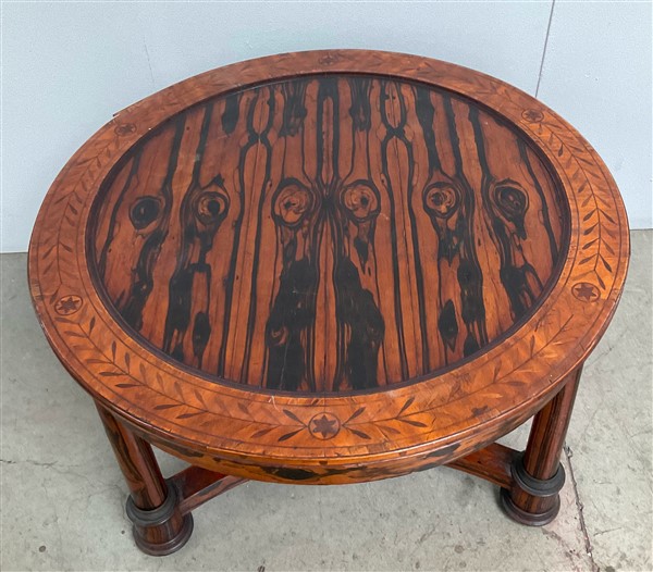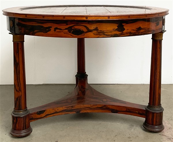 Tavolo da centro con piano circolare interamente lastronato in radica con bordura intarsiata a motivi fogliati e fiore stilizzato. Tre gambe a colonna raccordate da pianetto sagomato, bordure e capitelli in bronzo dorato. Secolo XIX (d. cm 99; h. cm 71) (difetti e restauri)