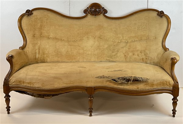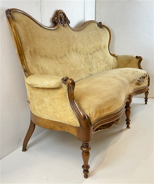 Divano Luigi Filippo in noce con schienale sagomato decorato da intagli a valva di conchiglia, gambe tornite, secolo XIX (L cm 190) (difetti)